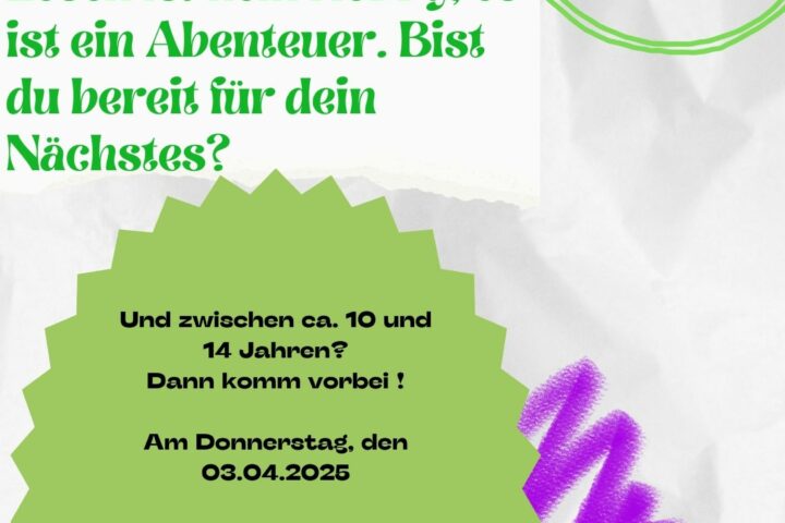 Für alle zwischen ca. 10 und 14 Jahren, die gerne lesen! Welches Buch fesselt dich gerade? Bringe es bitte mit!