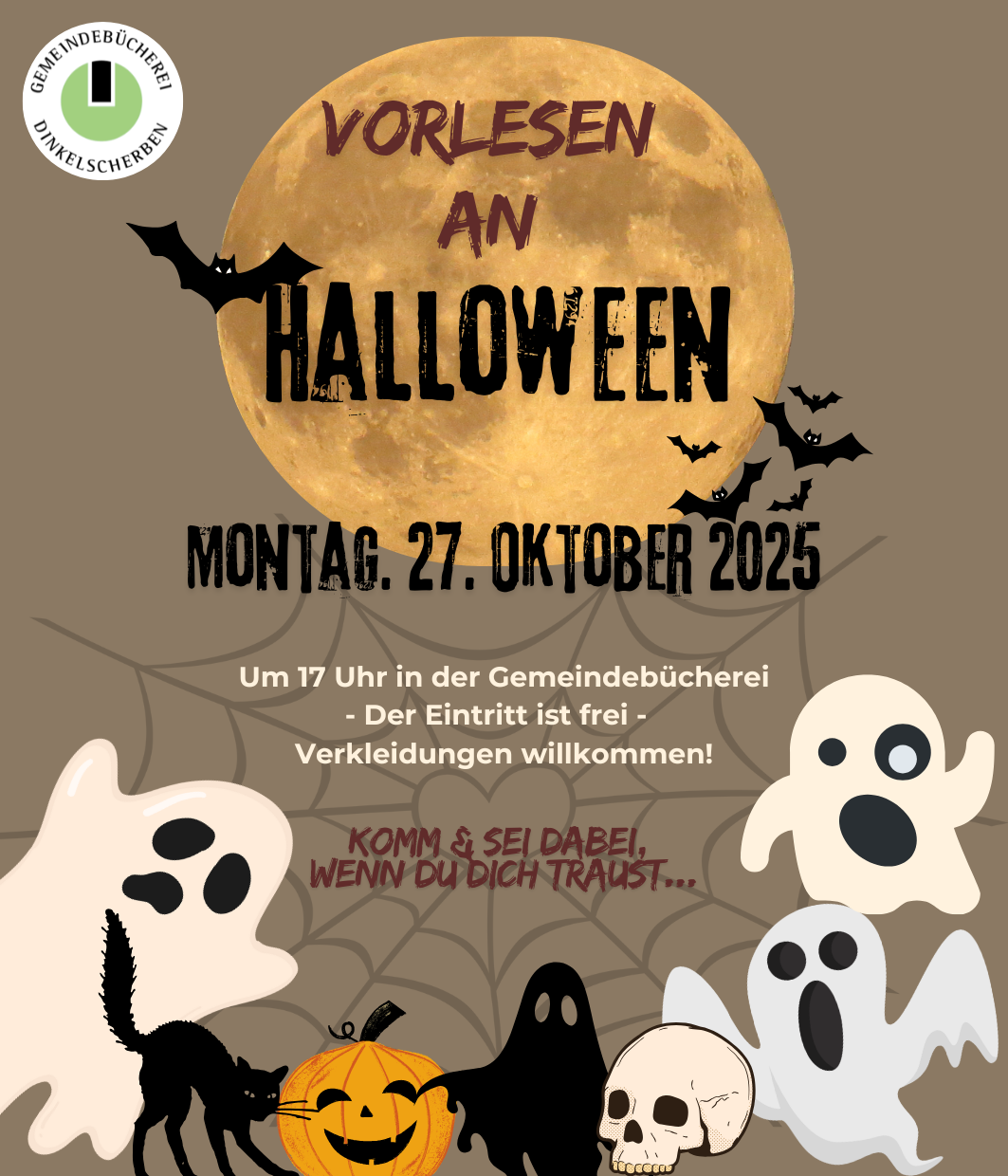 Am Montag 27. Oktober (17 Uhr) ist es wieder so weit. In unserer Bücherei ist es ziemlich dunkel, die Lichter flackern und die Spinnen haben ihre Netze gespannt. Schaurig heult der Wind um die Ecken und wir kauern uns zusammen um gemeinsam die tolle Geschichte anzuhören, die wir für euch für euch ausgesucht haben. Komm vorbei und sei mit dabei – wenn du dich traust ….